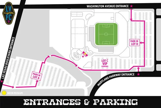 When arriving at Cashman Field for tonight’s match, fans can enter through two entrances: Las Vegas Boulevard and Maryland Parkway. General parking is located in Lots A and D, while VIP parking is located in Lot C. Please see map below.